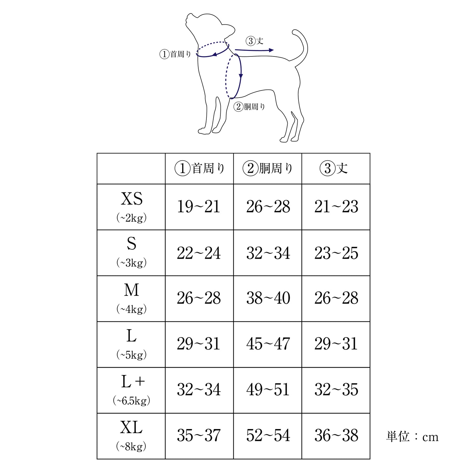 小型犬用のXS(1.5~2kg)・S(〜3kg)・M(〜4kg)・L(~5kg)・L+(〜6.5kg)・XL(~7kg)の5サイズ展開です。